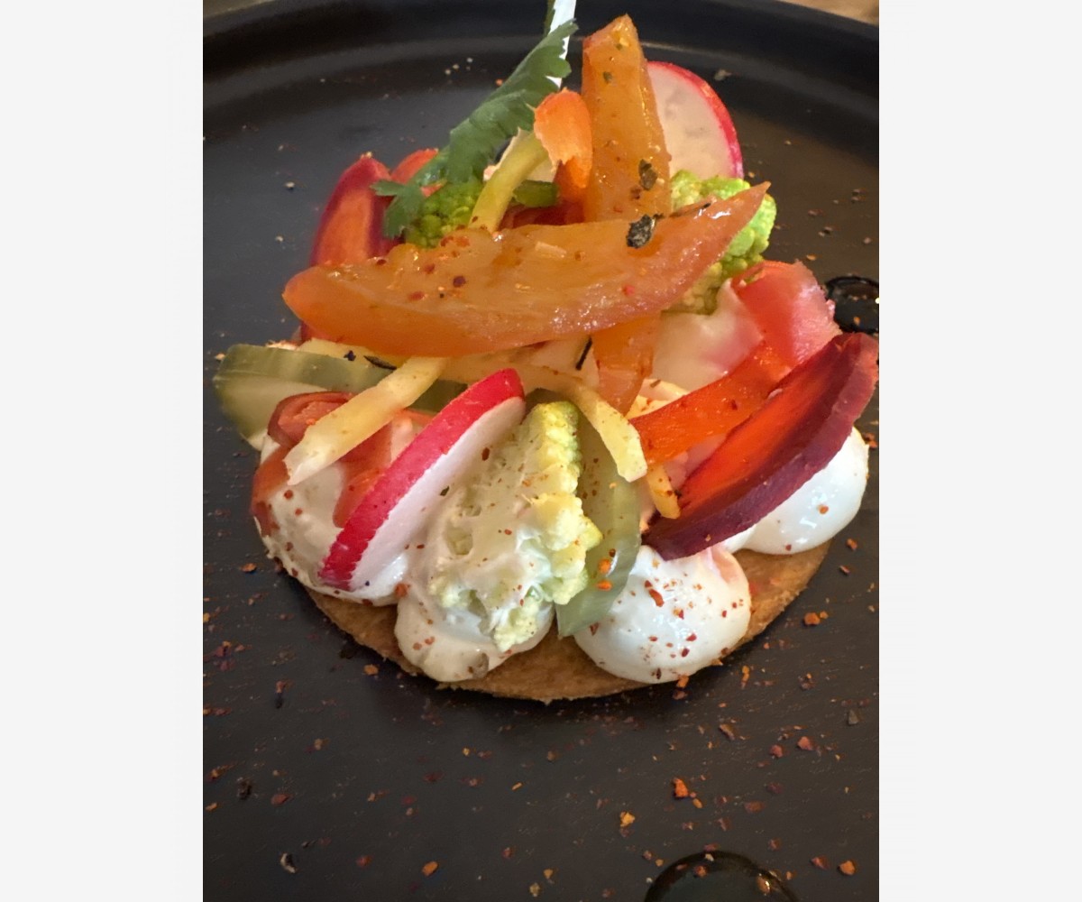 Tarte au camembert champ secret , légumes croquants