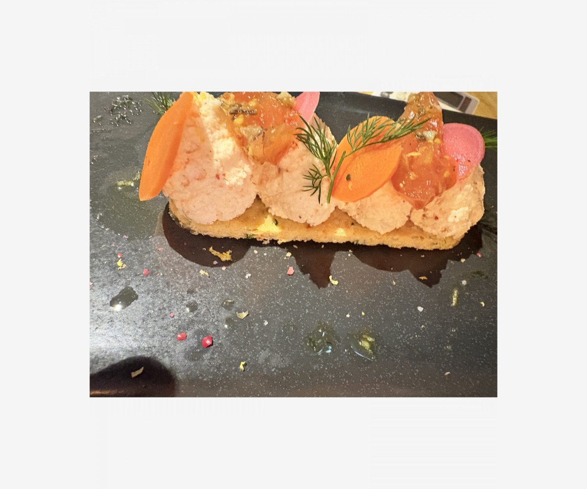 Sablé aux herbes, mousse de gambas , légumes de saison