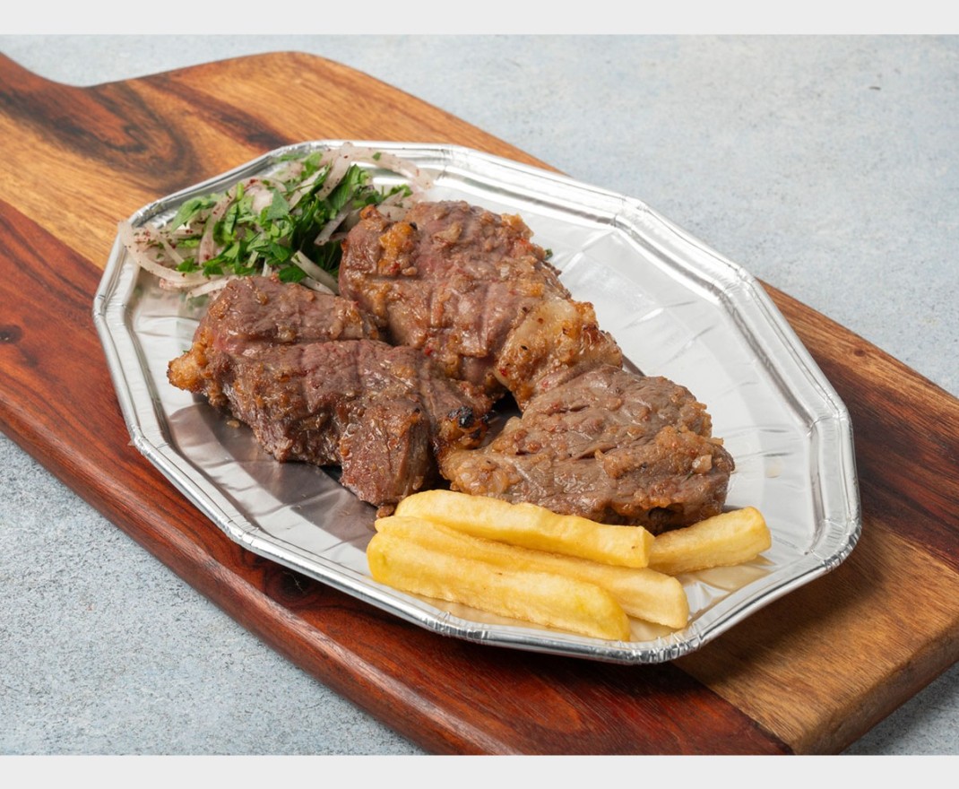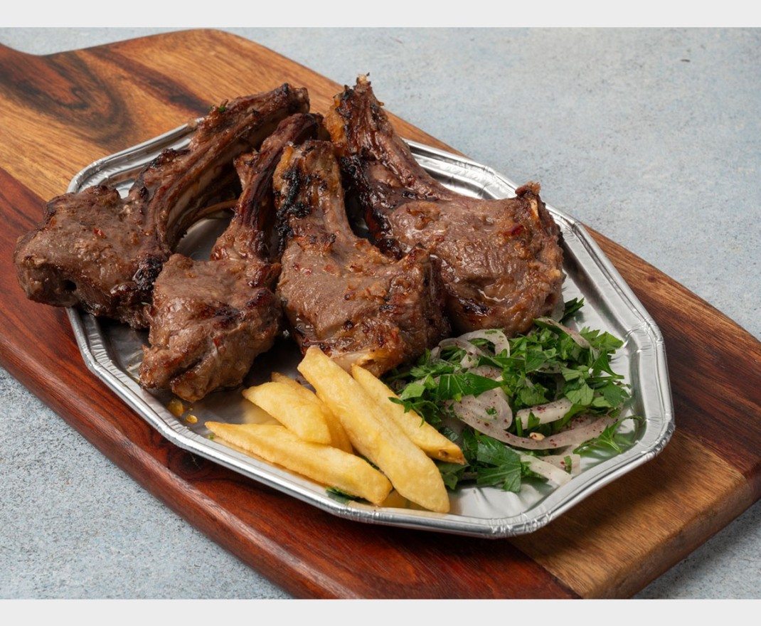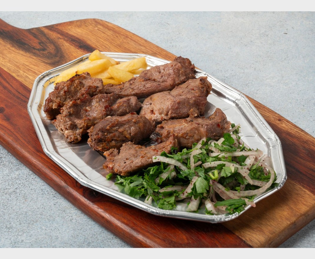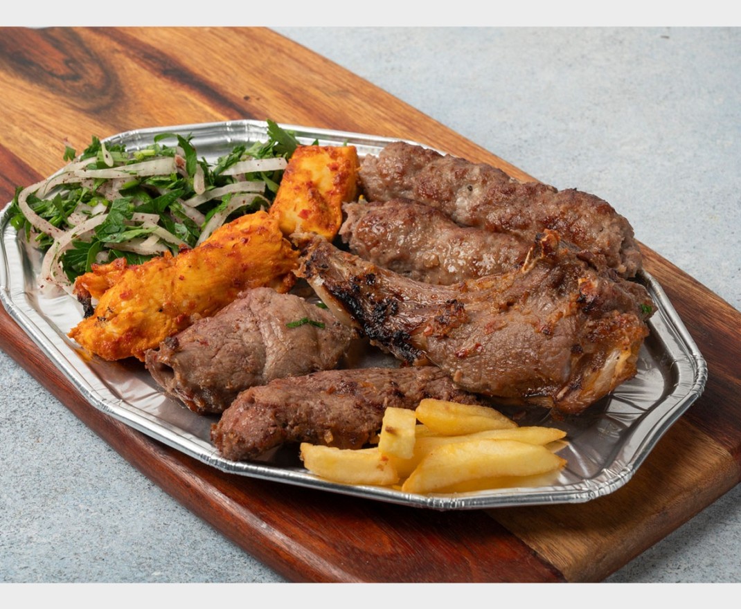 Kebab kofta tarb shish tawook lamb chopswith French fries +tahina+Green salad +Breads +Pickles