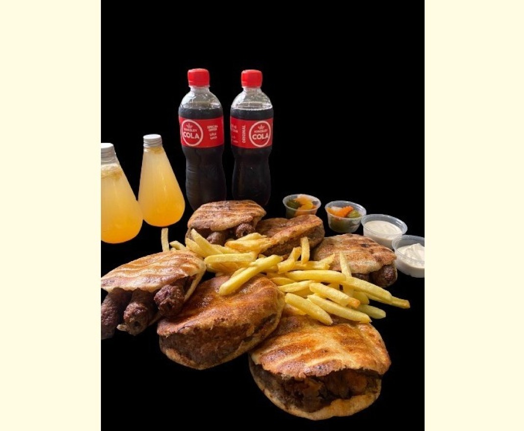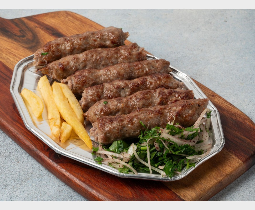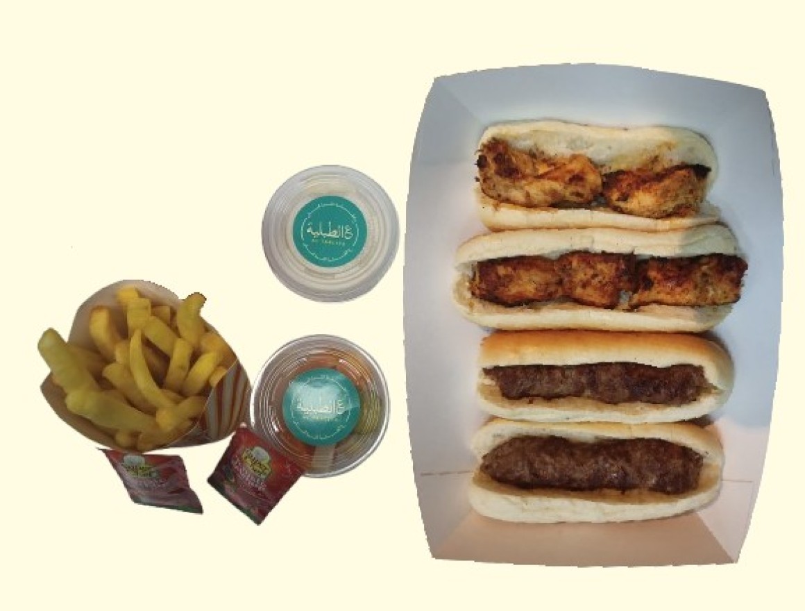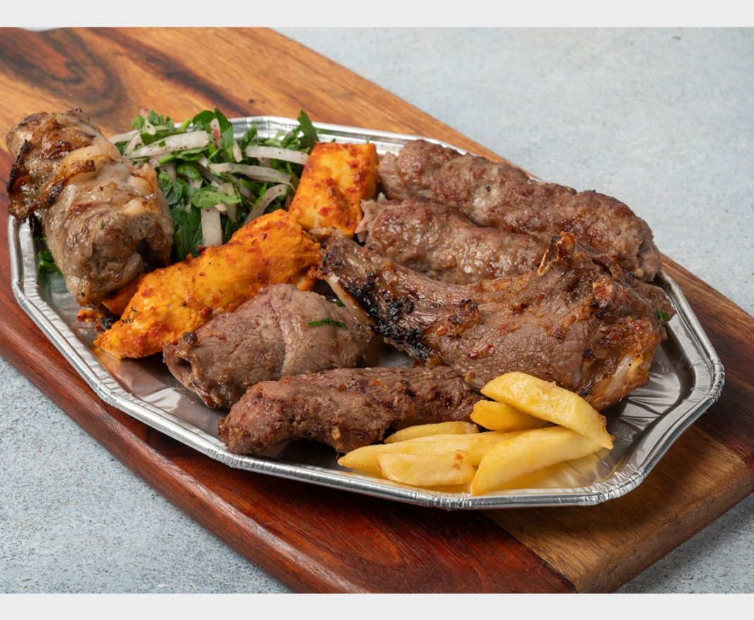 Kebab kofta tarb shish tawookwith French fries +tahina+Green salad +Breads +Pickles