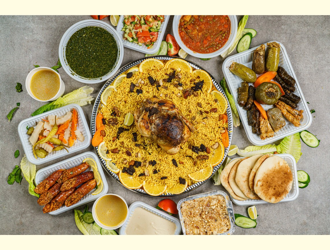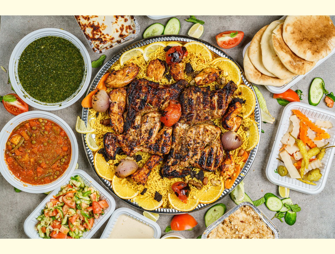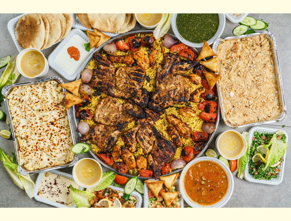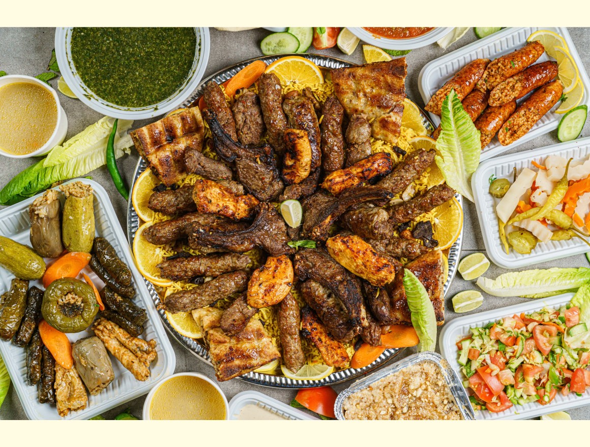 Main course: Half chicken grilled or roasts served with Molokhia or mashed potato, Okra with veal meat Tajin,Mixed vegetable with meat Tajin, Grilled kofta 5 pieces,Mix grill kofta 3 pieces with shish tawook 2 pieces, Vine leaves with akawi Tajin, Fattah with fried veal meat,Fattah with kaware