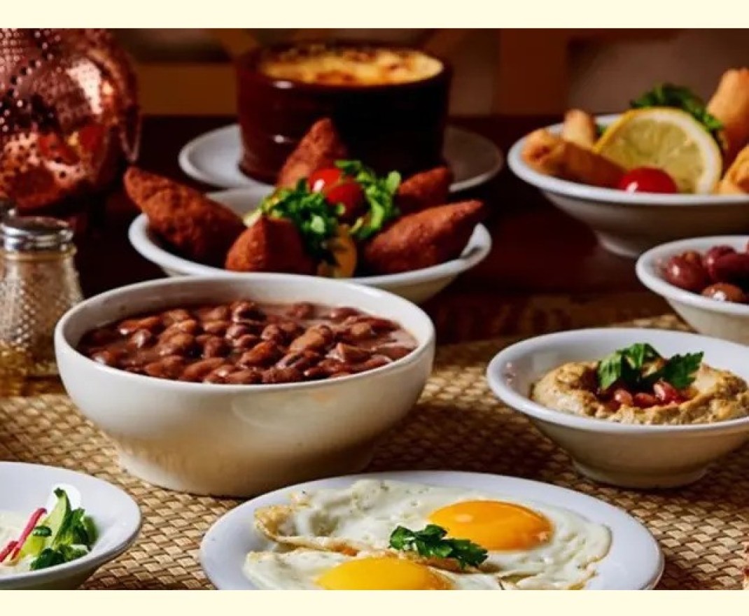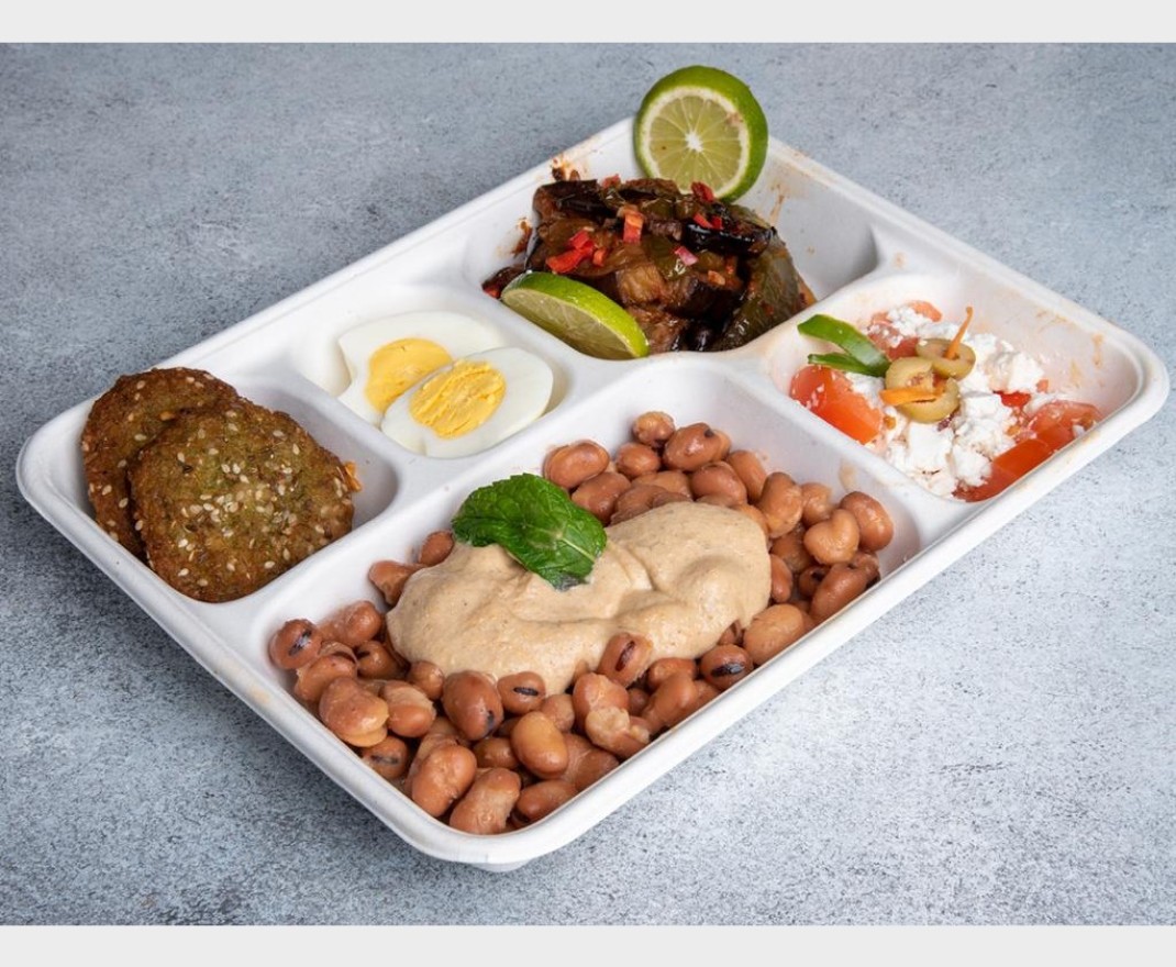 Foul, falafel, white cheese with tomato, 1 boiled egg, mousaka, pickles and Arabic breadBreakfast Dishes