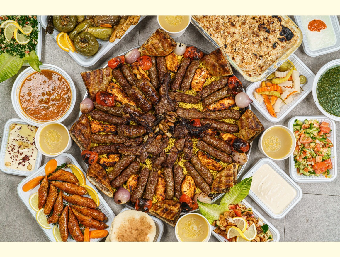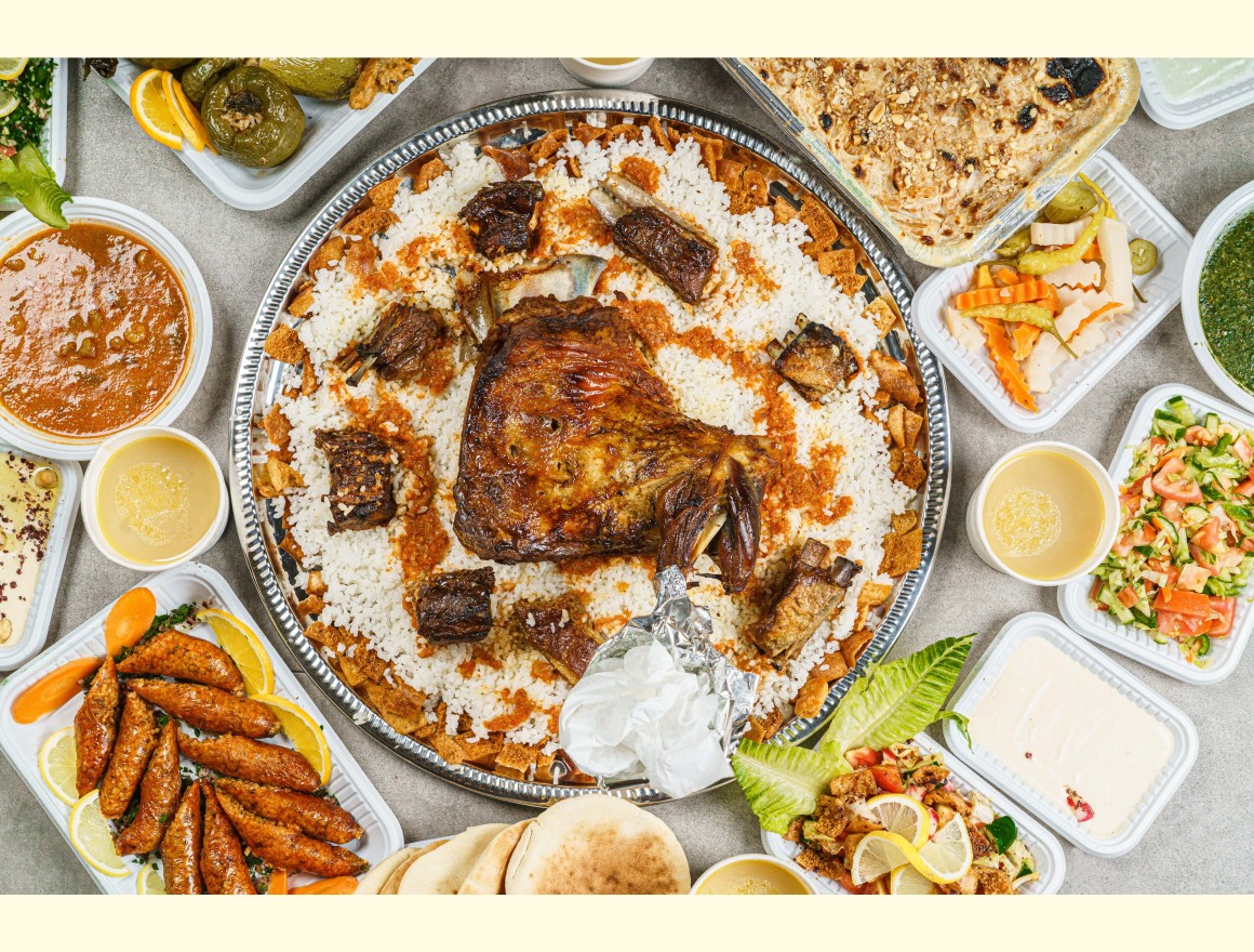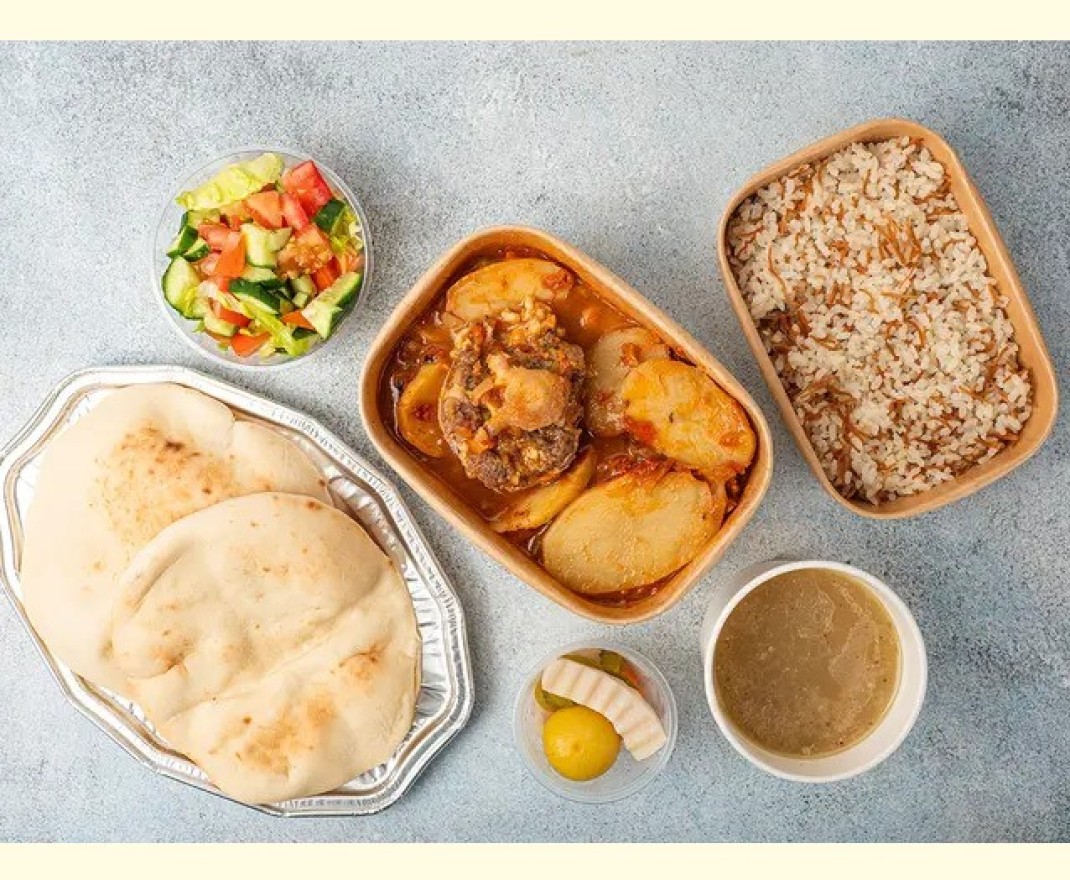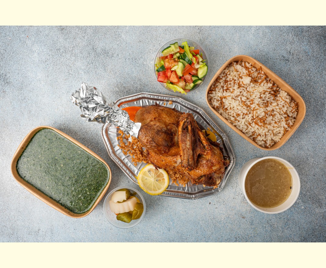 Served with Mulokhia, green salad, orzo soup, vermicelli rice and Arabic bread